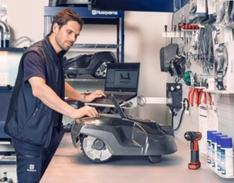 A Grönway robotfűnyíró hotelben a gép optimális körülmények között pihen, rendszeresen töltik, ellenőrzik, tavasszal tökéletes állapotban, készen kerülhet vissza a tulajdonosához.